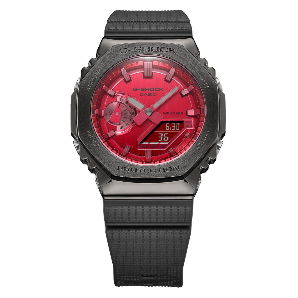 Il nuovo GM-2100 mantiene la forma geometrica e il design slim del GA-2100, ma presenta una nuova lunetta in acciaio forgiato che dona all’orologio un look più deciso. La finitura sottile della parte superiore della lunetta e l’effetto specchiato sui lati conferiscono una lucentezza metallica. La lunetta dell’orologio è disponibile con finitura IP silver-blu (GM-2100N) o IP dark silver (GM-2100B) per soddisfare qualsiasi esigenza di stile. Il quadrante è sottoposto al trattamento PVD nelle nuove tonalità navy, green e red per ottenere un accattivante effetto metallico. Il cinturino presenta una lavorazione reticolare con variazioni incrementali nelle dimensioni dei quadratini, che crea un look geometrico in linea con il design del quadrante.