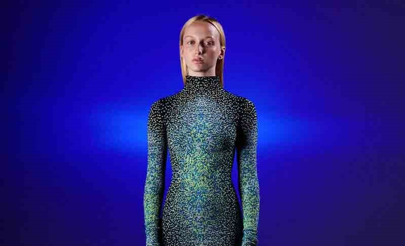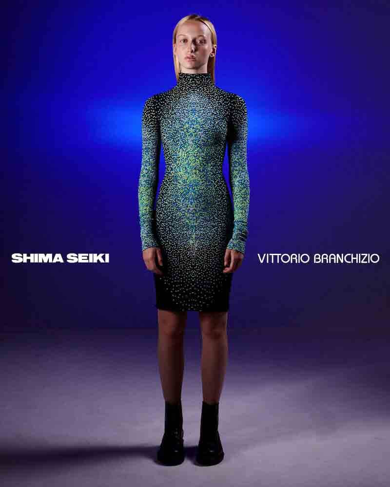 Nella collezione di Branchizio spicca un abito realizzato completamente con filato Exté di MIC Spa, sulla macchina FIRST 124 F21, unica al mondo per la finezza 21 nelle macchine da maglieria.