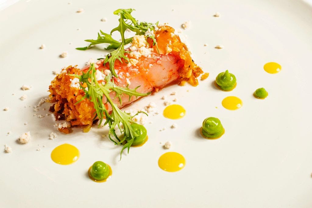 Con le code di gambero, eliminare il budello e stendere tra due fogli di carta da forno con l’aiuto di un batticarne stendere fino ad ottenere un foglio dal spessore di 3 millimetri, salare e riporre la lavorazione per 30 minuti in abbattitore.