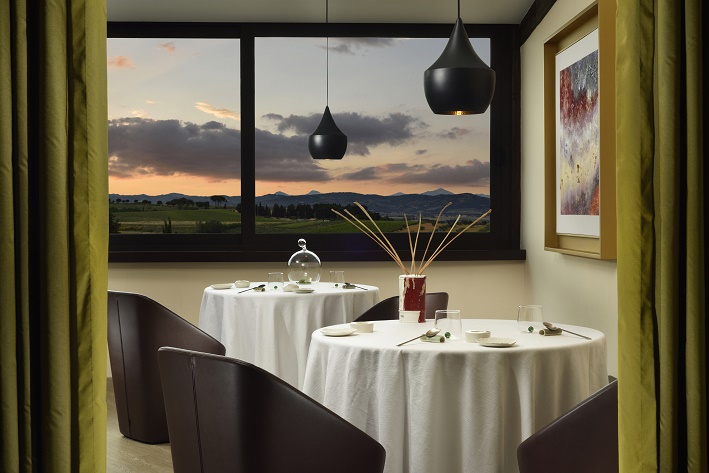 L’esperienza culinaria è strettamente legata alla location che la ospita. Elementi Fine Dining si distingue per l’ambiente raffinato ed elegante, lo charme e la vista: la grande vetrata domina la campagna umbra e svela Perugia. Intimo e raccolto, mette a disposizione tavoli ben distanziati, per far vivere momenti di quiete e armonia, da sempre prerogative del Resort. Nulla è lasciato al caso, tanto meno la mis en place,minimalista e quasi poetica, con la classe di Domiziani che coloragli spazi dedicati alla degustazione.