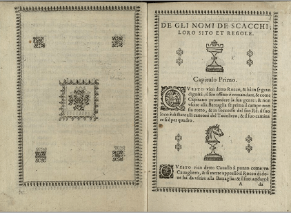 Cliccando su questo link è consultabile il Libro nel quale si tratta della maniera di giuocar’ à scacchi, edito a Torino nel 1597 “appresso Antonio de’ Bianchi”, uno dei tesori conservati nella Biblioteca storica della Città metropolitana intitolata a Giuseppe Grosso e recentemente informatizzati grazie al laboratorio DigiBESS sito presso il CNR torinese.