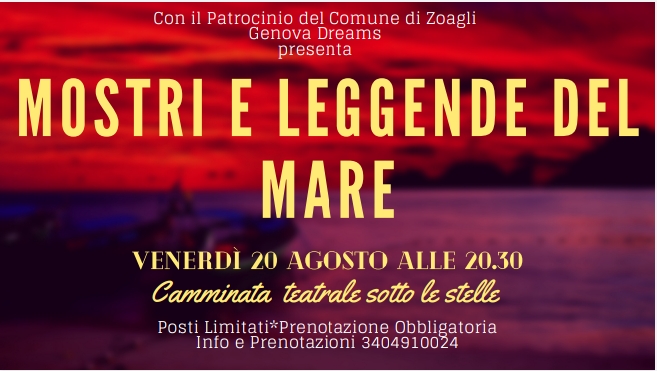 Dopo il grande successo ottenuto a Sestri Levante, Genova Dreams è lieta di presentare con il patrocinio del Comune di Zoagli “Mostri e Leggende del Mare” edizione speciale, che si terrà venerdì 20 agosto alle 20.30.