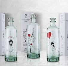I disegni sono applicati con colori inorganici in serigrafia diretta a caldo. Durante il processo di lavorazione, la polvere di vetro colorata va a fondersi con il vetro della bottiglia e rende la stampa al 100% ecologica e resistente ai graffi.