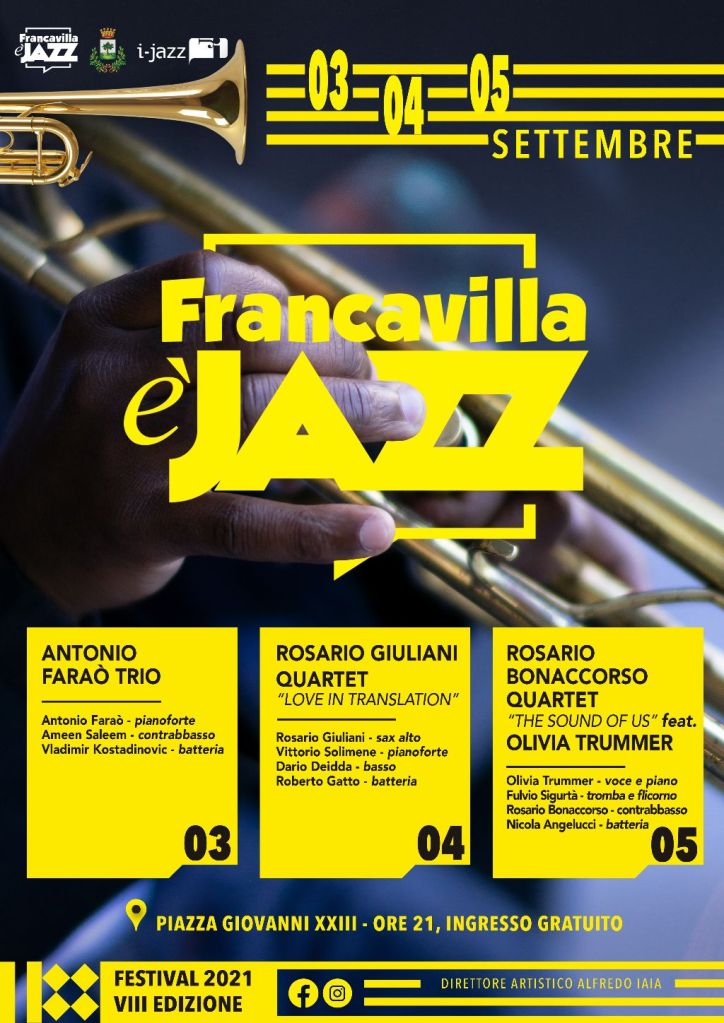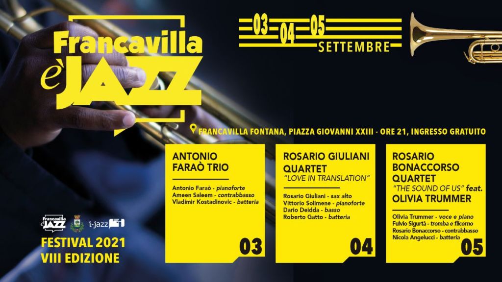 Cresce sempre più l’attesa per l’ottava edizione del Francavilla è Jazz di Francavilla Fontana, rassegna di punta e irrinunciabile punto di riferimento per tutti i jazzofili provenienti dalla Puglia (e non solo). Anche quest’anno la location sarà Piazza Giovanni XXIII, con lo sfondo della Basilica Pontificia Minore del Santissimo Rosario, perla dell’architettura barocca e simbolo storico della città, di straordinaria importanza,soprattutto per i cittadini francavillesi, particolarmente legati a questo luogo. Entrato a far parte dell’Associazione I-Jazz, associazione nazionale che raccoglie alcuni tra i più conosciuti e seguiti festival jazz italiani, il sipario sull’ottava edizione del Francavilla è Jazz si aprirà venerdì 3 settembre alle 21:00 (orario d’inizio previsto per tutti i concerti a ingresso libero) con Antonio Faraò Trio, formidabile formazione costituita da Antonio Faraò al pianoforte, Ameen Saleem al contrabbasso e Vladimir Kostadinovic alla batteria. Faraò, pupillo del grande Herbie Hancock, nonché attualmente uno fra i migliori pianisti jazz italiani in ambito mondiale, proporrà insieme a due fuoriclasse assoluti come Saleem e Kostadinovicun repertorio che attinge da alcune sue composizioni originali facenti parte della sua discografia, oltre a standard, (ri)arrangiati in chiave moderna, appartenenti alla tradizione jazzistica. Si proseguirà il 4 settembre con Rosario Giuliani Quartet – “Love in Translation”. Il quartetto diretto da Rosario Giuliani, sassofonista tra i più blasonati nel circuito jazzisticointernazionale, presenterà “Love in Translation”al fianco di Vittorio Solimene al pianoforte, Dario Deidda al basso e Roberto Gatto alla batteria, una sezione ritmica di livello eccelso. Il sassofonista di Terracina presenterà questa sua nuova creatura discografica, pubblicata nel 2020 da Jando Music/Via Veneto Jazz, contenente alcuni storici standard jazz della tradizione, sue composizioni originali e brani autografati da Joe Locke, fenomenale vibrafonista jazz statunitense. L’album, come indica lo stesso titolo, è incentrato sull’amore.