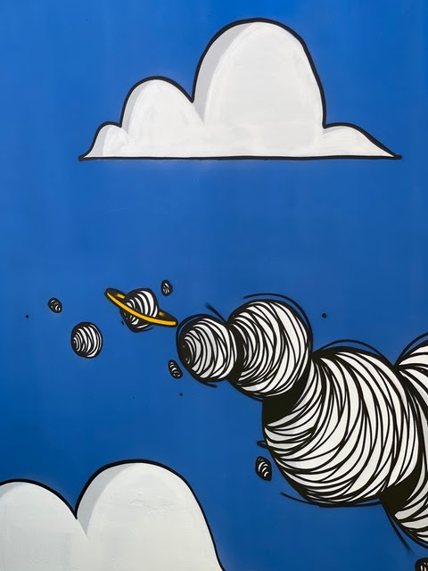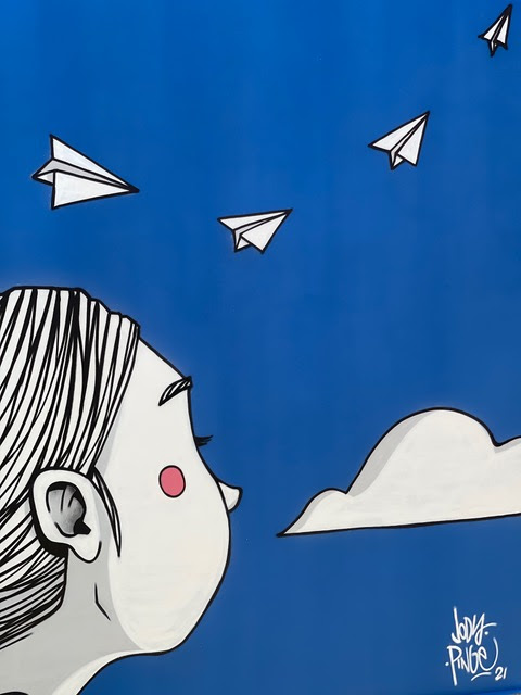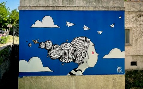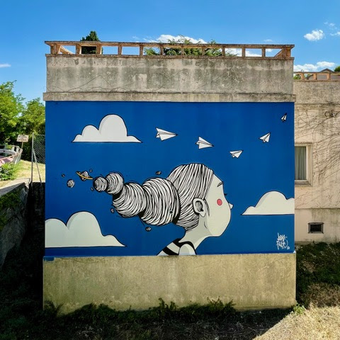 Le altre due nuove opere invece sono degli artisti Jody Pinge e Simone Travaglini. Il primo ha realizzato il suo intervento su un muro della Scuola dell’Infanzia Aquilone, ha intitolato la sua opera Leggerezza e ha ritratto una bambina dai cui capelli nascono pianeti: la leggerezza dei pensieri che hanno i bambini, ispirandosi a ciò che diceva Italo Calvino “Prendete la vita con leggerezza, ché leggerezza non è superficialità, ma planare sulle cose dall’alto, non avere macigni sul cuore”.