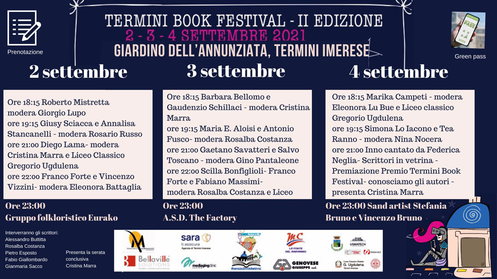 Il Termini Book Festival 2021 è realizzato grazie al gratuito patrocinio del Comune di Termini Imerese e ai mecenati Antonio Bellaville (Bellaville Solutions), Filippo Costanza (Mc risparmio), Giuseppe Genovese (Gruppo Genovese), Francesco Marramaldo, Fabrizio Melfa (Mediaging clinic), Giuseppe Veca eSara Assicurazioni.