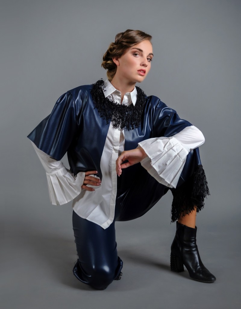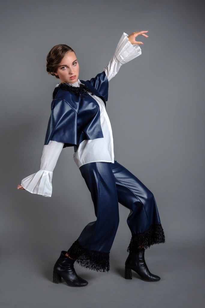 La camicia bianca è indossata con un completo in ecopelle composto da una corta giacca abbinata a pantaloni alla caviglia impreziositi da frange.