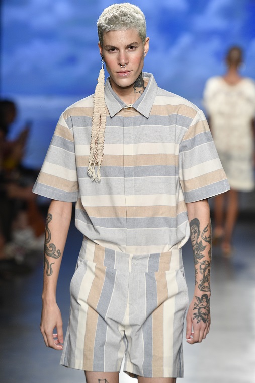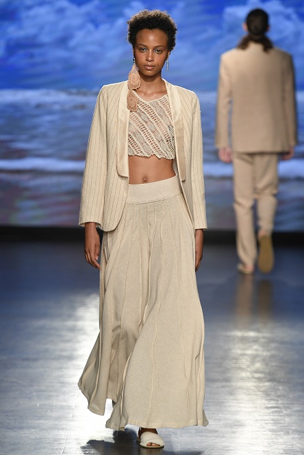 Natural Cotton Color rafforza la sua identità di sostenitore del cotone organico e del artigianato locale, riproducendo nella sfilata la musica più popolare di un’icona di Paraíba e del Brasile: Jackson do Pandeiro. Conosciuto come “O Rei do Rhythm”, il cantante, compositore e polistrumentista riflette nella canzone “Chicletecom banana” la preoccupazione di mantenere il samba puro, libero dall’influenza di ritmi stranieri.