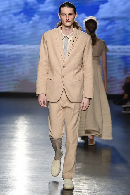 Gli abiti classici maschili sono stati reinventati in pile con cotone e seta, inoltre, nella collezione, lo smoking non è realizzato nel classico colore nero, ma in marrone, colore naturale del cotone organico colorato.