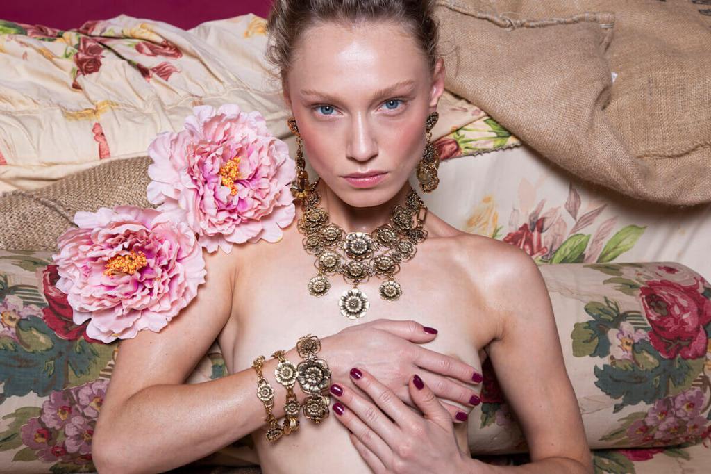 L’estro di Daniela Ravaioli, anima creativa del brand Radà, sfocia in un raffinato ritratto dai fiori dorati, perfetti per impreziosire ed ingentilire la nuova stagione.