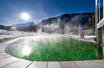 Ultima ma non ultima, la vista dalla Black Pool a 30° del 5 stelle Romantik Hotel Turm di Fié allo Sciliar (BZ) sul paesaggio circostante è da togliere il fiato. Il massiccio montuoso dello Sciliar diventa straordinariamente suggestivo quando la neve lo imbianca. Dalla piscina all’aperto si può anche accedere direttamente, attraverso un percorso d’acqua collegato, alla piscina interna, e poi magari decidere di rilassarsi nella sauna al pino mugo, nel bagno turco aromatico, oppure preferendo la grotta di sale e la nuova sauna di fuoco all’aperto, che si aggiunge alla sala fitness panoramica e alla sala relax di recente realizzazione. (Tel. 0471725014).