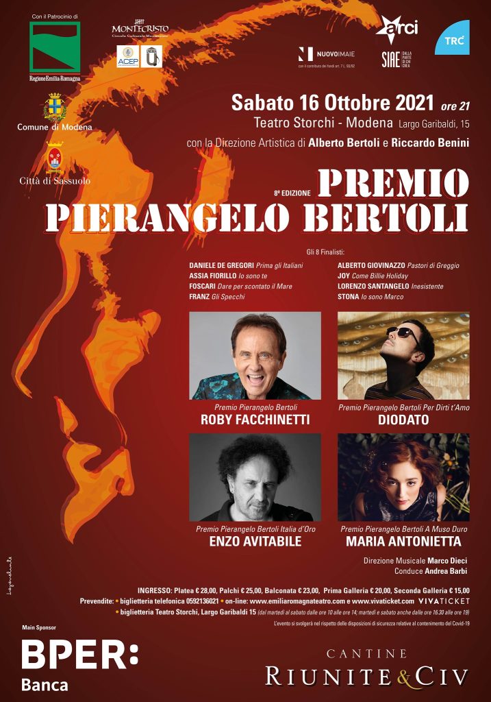 Il Premio Pierangelo Bertoli 2020 va a ROBY FACCHINETTI. Il riconoscimento gli verrà conferito durante la serata finale di sabato 16 ottobre 2021(ore 21.00), condotta da Andrea Barbi, al Teatro Storchi di Modena (Largo Garibaldi, 15).