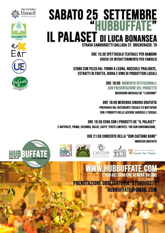 Sabato 25 settembre alle 15,30 al Palaset di Bricherasio sono in programma uno spettacolo teatrale per bambini e giochi di intrattenimento. Si potrà assistere alla cottura delle pizze nel forno a legna e degustarle, insieme alle nocciole dolci e salate, agli estratti di frutta, alla birra e al vino dei produttori locali. Alle 18 il momento istituzionale, con la presentazione del progetto Hubbuffate, con le incursioni musicali de “I Liocorni”. La merenda sinoira gratuita è a cura del ristorante sociale Ex Mattatoio di Chieri, che utilizza i prodotti delle aziende agricole e sociali. A seguire si può anche cenare con i prodotti dell’azienda Palaset al costo di 19 euro per gli adulti e 10 per i bambini. La serata è allietata dal concerto della Don Caetano Band. Per informazioni e prenotazioni si può chiamare il numero telefonico 375-6200271.