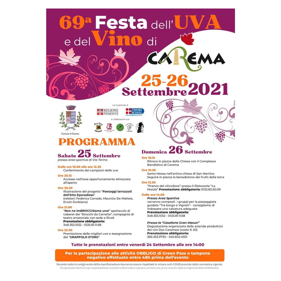 Sabato 25 e domenica 26 settembre torna la Festa dell’Uva e del Vino di Carema, che promuove l’immagine della vitivinicoltura eroica del Canavese. La sessantanovesima edizione dell’evento organizzato dal Comune in collaborazione con le associazioni locali e la Cantina produttori Nebbiolo di Carema deve fare i conti con le misure di contenimento della pandemia, ma dimostra la tenacia dei produttori locali. La festa è patrocinata dalla Città Metropolitana di Torino ed inizia sabato 25 alle 10 negli ampi spazi all’aperto del centro sportivo comunale, dove avviene il conferimento dei campioni delle uve, in coincidenza con l’insediamento della commissione di esperti. Le premiazioni e l’assegnazione del “Grappolo d’oro” chiudono la serata prefestiva alle 22,30, ma sono precedute alle 20,30 dall’illustrazione del progetto “Paesaggi terrazzati dell’Alto Eporediese”.