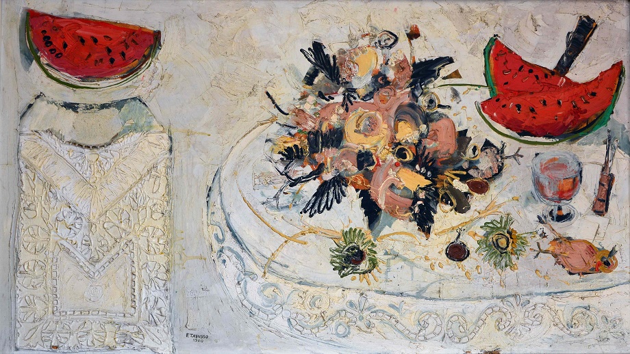 Le opere degli esordi testimoniano i primi passi mossi alla scuola di Felice Casorati, da cui Tabusso apprende non solo l’amore per il mestiere e il dialogo con i maestri antichi, ma anche la capacità di trasfigurare il reale, proiettandolo in una dimensione incantata, fuori dal tempo. Tra la fine degli anni Cinquanta e l’inizio dei Sessanta, Tabusso intensifica il dialogo con il linguaggio informale, sempre nel solco della figurazione e della pittura di racconto. Di questo periodo nelle ampie sale dell’Archivio di Stato, è esposta una selezione di opere giovanili di collezione pubblica, raccolte per la prima volta in un’antologica dedicata al pittore: la Festa Campestreche la Galleria Ricci Oddi di Piacenza acquistò alla Biennale di Venezia del 1954, i Boscaiolidel Museo del Novecento di Milano, o ancora Il taglio del boscoopera vincitrice del Premio del Golfo ed entrata così nella collezione del CAMeC di La Spezia.