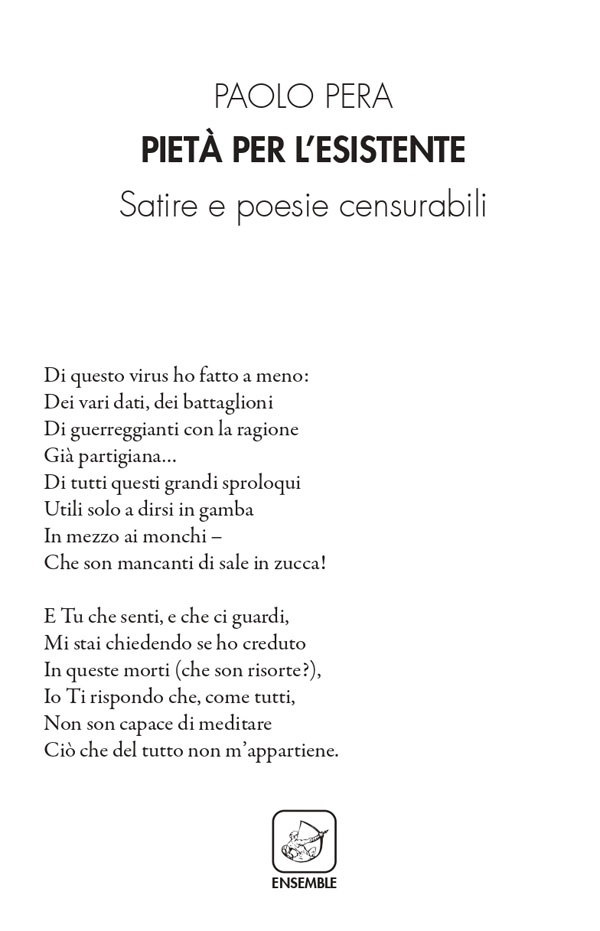 È disponibile in libreria e negli store online Pietà per l’esistente. Satire e poesie censurabili (Ensemble Edizioni) di Paolo Pera, una variegata raccolta di testi critici (sferzanti, seppur ironicamente) verso la contemporaneità̀ politica, religiosa, estetica e umana.