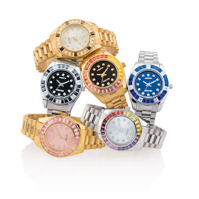 Sono 28 le pietre taglio baguette che illuminano la lunetta del nuovo segnatempo Hoops abbinando scintillanti cromie ad incorniciare il quadrante soleil dagli index in strass di Montecarlo in un elegante ed armonico pendant che va dai classici nero e bianco ai più colorati rosa, verde e blu navy fino alla singolare proposta con pietre multicolor.