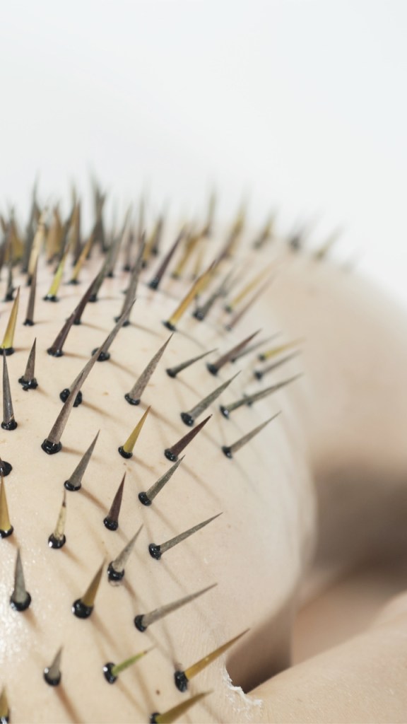 In effetti Ecdysis, letteralmente “fare la muta”, indica espressamente un cambiamento che a partire dallo strato più materiale ed esterno, la pelle, muove verso quello più profondo, che resta per lo più nascosto dalla struttura e talvolta dalle resistenze morali. Un processo di mutazione, che prendendo a modello la metamorfosi della forma nel mondo animale, assume una connotazione più ampia che a partire dall’artista –la prima ad attivare su se stessa questo processo di distruzione, cambiamento e nuova nascita (emblematica in tal senso la serie fotografica Deimatico, realizzata in collaborazione con Massimiliano Camellini e scelta come immagine guida della mostra) – si estende idealmente a tutta l’umanità, manifestando l’urgenza di un’evoluzione, i cui resti sono abbandonati in favore di un corpo rinnovato, in una combinazione programmata o istintiva di distruzione e di crescita.
