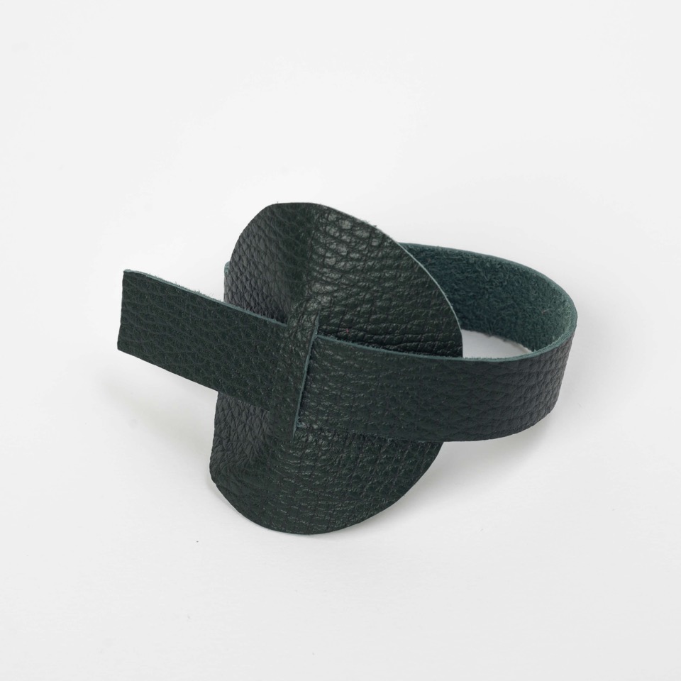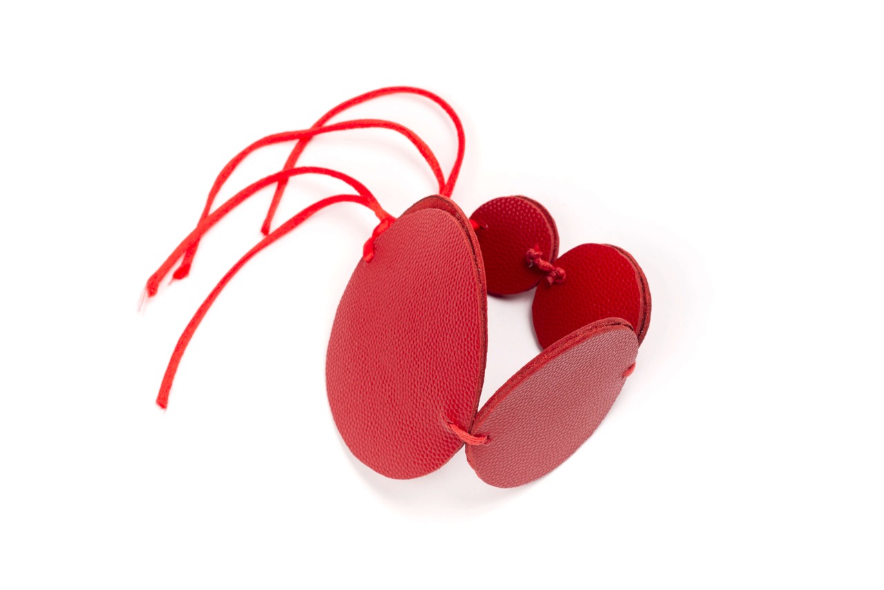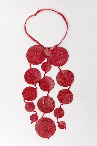 Per quanto riguarda la collana, in questa occasione Emanuela Salatino “trasforma” le forme di pelle upcycled in perline intrecciandole tra loro con un cordino in seta intrecciata, scelto e preferito rispetto la classica catenella per evitare a chi indossa i gioielli di dover stare a contatto con il metallo.