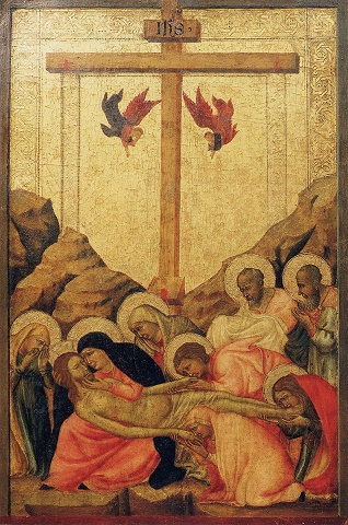 La mostra prende l’avvio da eccezionali documenti figurativi, provenienti da Firenze e Castefiorentino: la “Madonna con il Bambino” di Cimabue, con il più che probabile intervento del giovane Giotto, e il “Santo Stefano” eseguito da Giotto negli anni della piena maturità, tra il 1320 e il 1325, quando in contemporanea è attivo a illustrare le vicende di “San Francesco” nella Cappella Bardi a Santa Croce. A questi sono associati un considerevole nucleo di dipinti a fondo oro, la cui realizzazione si colloca negli anni della vicenda biografica dantesca e giottesca, provenienti dalla Collezione permanente, ad iniziare dal “Compianto” di Lippo di Benivieni, compiuto a Firenze allo scadere del XIII secolo, per giungere al malinconico “San Giovanni nel deserto” del più abile tra gli allievi di Giotto, il raffinato Bernardo Daddi.
