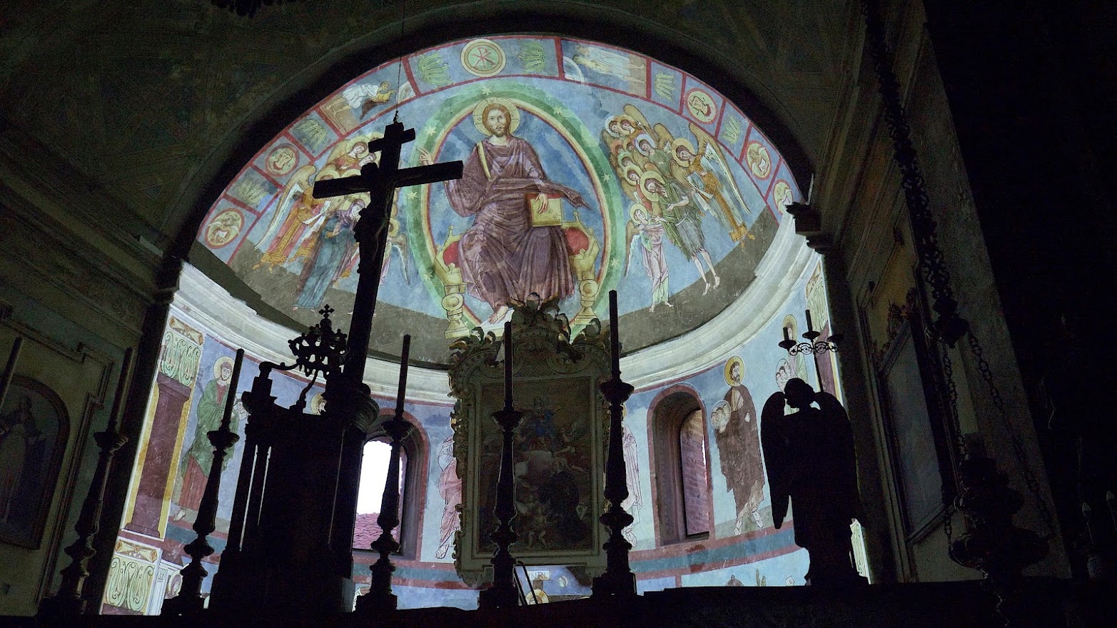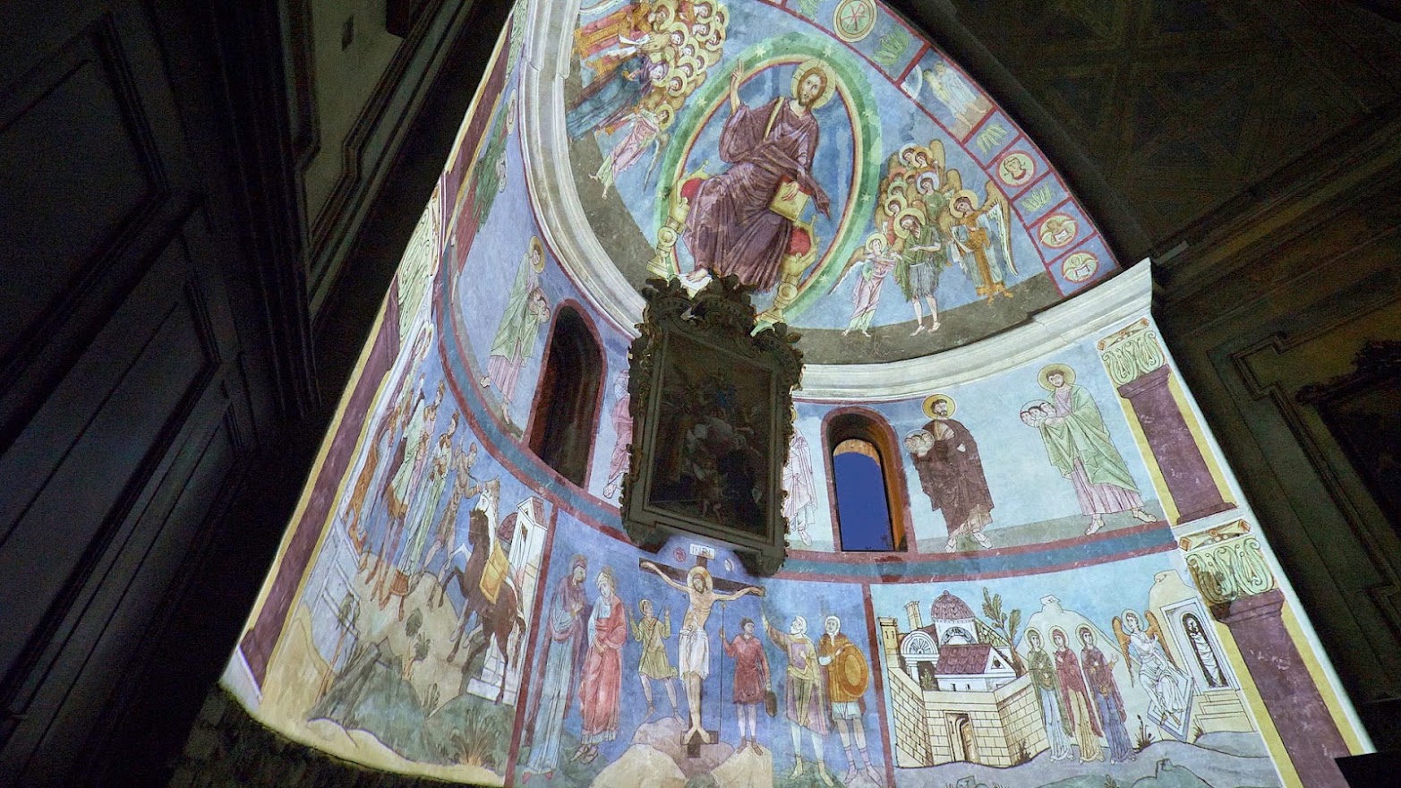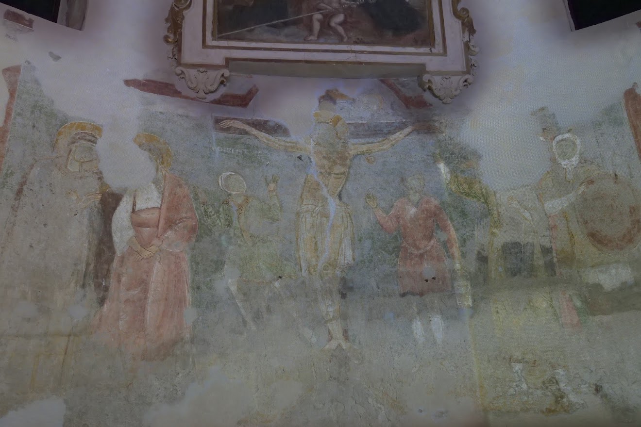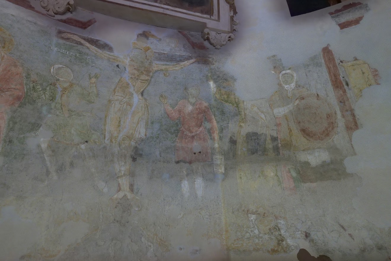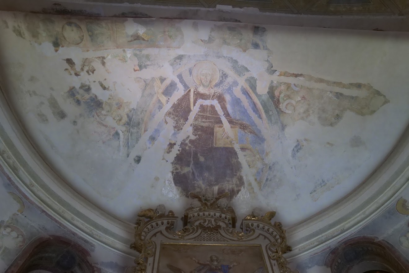 In seguito ad una campagna di restauri partita nel 2010 si è scoperto un importantissimo ciclo pittorico di derivazione bizantina risalente alla fine dell’XI secolo. Il ciclo pittorico del catino absidale è suddiviso in tre livelli: nel primo, che coinvolge la fascia inferiore, sono illustrate alcune scene dei Vangeli tra le quali emerge, ancora ben conservata, quella della Crocifissione; nella fascia mediana, caratterizzata dalla presenza di monofore che servivano a dare luce all’ambiente, si ritrovano le figure degli apostoli Pietro e Paolo e dei patriarchi che accompagnano le anime al giudizio; nel terzo e ultimo livello, quello della calotta absidale, compare nella sua magnificenza il Cristo benedicente e ai suoi lati la Vergine Maria e San Giovanni Battista. Si tratta di uno dei ritrovamenti più importanti degli ultimi decenni per l’ampiezza della superficie pittorica recuperata, la raffinatezza dell’esecuzione, l’eccezionalità dell’iconografia, la qualità degli affreschi e l’accertato utilizzo di materiali preziosi come il blu di lapislazzuli e la lamina di metallo dorato applicata all’aureola in stucco del Cristo.