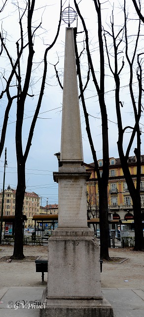 In realtà questo obelisco fu eretto nel 1808 (il 7 dicembre per la precisione) su un punto geodetico (una particolare curva che descrive localmente la traiettoria più breve fra punti) in ricordo di un vecchio calcolo trigonometrico del 1760 sulla lunghezza di una porzione di meridiano terrestre (il Gradus Taurinensis), eseguito, a opera di Giovanni Battista Beccaria, celebre geofisico e matematico piemontese (l’obelisco infatti è anche chiamato: “guglia Beccaria”), insieme ad altri punti geografici nei comuni piemontesi di Rivoli (dove si trova un obelisco gemello), di Andrate e di Mondovì.