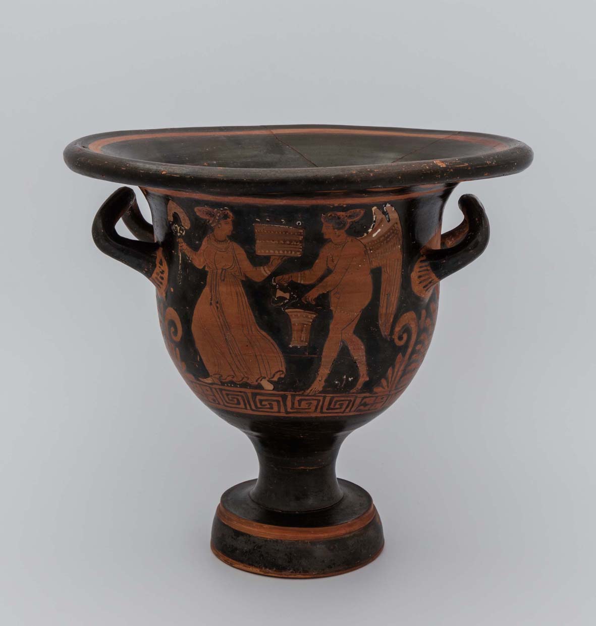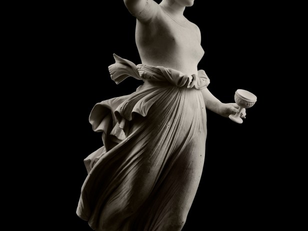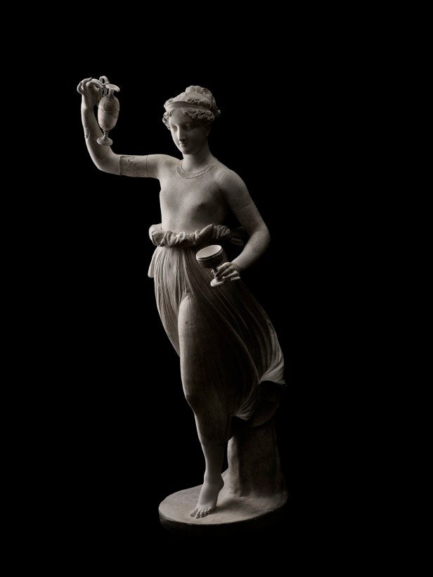 Sfuggente ma al contempo intrigante, il mito di Ebe ha conosciuto, attraverso i secoli, un’alterna fortuna nella cultura occidentale. Citata da Omero e da Esiodo, a Ebe, figlia di Zeus e di Era, spettava il ruolo di enofora, l’ancella delle divinità. Il misterioso nettare che mesceva donava l’immortalità e l’eterna giovinezza. Dopo il matrimonio con Eracle, il suo ruolo di coppiera degli dèi fu assegnato a Ganimede. Profondo conoscitore del classico, nutrito della cultura antiquaria che nel Settecento rinveniva e classificava con dedizione i preziosi reperti antichi, Canova seppe condensare il mito di questa divinità adolescente in un’immagine emblematica, quella della gioventù colta all’apice della sua fiorente bellezza, in quel fugace momento di perfezione che anticipa l’età adulta. Ne realizzò due differenti versioni. La prima, in cui la giovane dea, che si appresta a mescere l’ambrosia, atterra su una spumosa nuvola; l’altra, colta mentre appoggia leggiadramente i piedi alla base di un tronco d’albero.