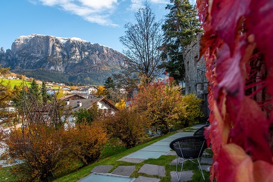 La vista dello Sciliar incastonato nel paesaggio incantato delle Dolomiti è unica dalle terrazze, il giardino e le finestre delle storiche camere del Romantik Hotel Turm, esclusivo 5 stelle di Fiè allo Sciliar (BZ) e uno dei cinque preziosi alberghi del marchio di lusso Pearls by Romantik.