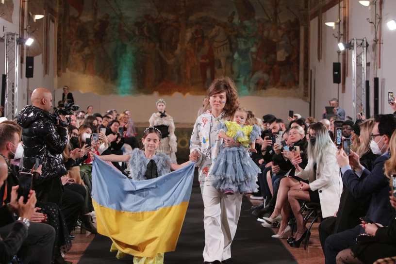 Sono solo otto i bimbi che sono riusciti ad arrivare in Italia, quando a Kiev vengono buttati dagli aerei giocattoli che contengono una bomba, ma qui, in Italia la sfilata è la rappresentazione artistica di una coscienza collettiva che si è diffusa all’improvviso, di una guerra che irrompe spezzando le fila ordinate di una quotidianità che si era ricostruita con tanta fatica.