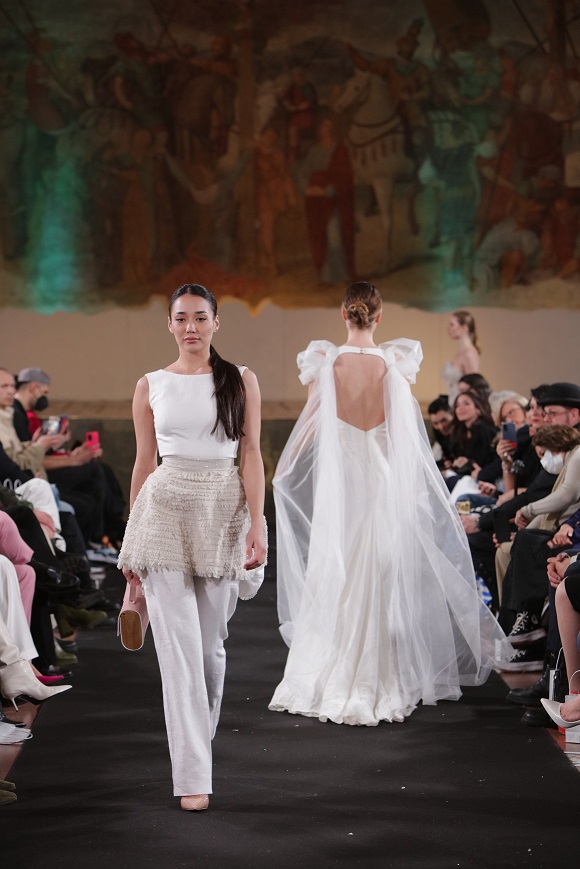 Non c’è stata spettacolarizzazione nella sfilata dei brand tra cui anche alcuni designer Ucraini, già progettata da tempo, il dramma che stiamo vivendo, che sta vivendo un popolo intero fatto di bimbi, di vecchi, di giovani è reso con lucidità e rispetto.