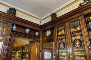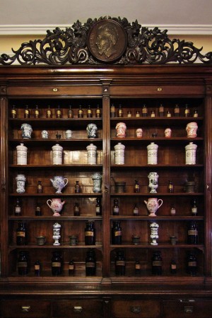 Ne perpetua la memoria il bancone, anch’esso in noce massiccio, sormontato da una lastra di marmo del periodo in cui si evidenzia, intarsiato a mano, il simbolo alchemico ed allegorico della “Teriaca”: un intreccio di serpenti incastonato in un motivo a forma di conchiglia dove essi si abbeverano.