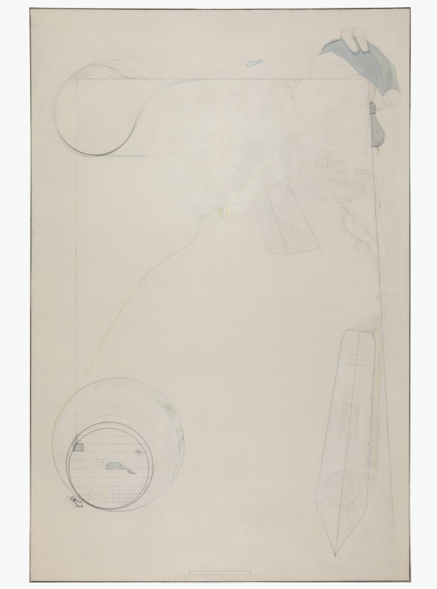 Tutt’attorno le “macchie di blank, di non-quadro, che interrompono l’universo del tessuto-quadro e ci danno la sensazione che il significato e la forma di tutto il resto fluttuino attorno a queste lacune dell’esistere”, secondo le parole di Italo Calvino, che apprezzava la sua arte ed ebbe modo di discuterne con lui in diversi incontri, tra Parigi e New York.