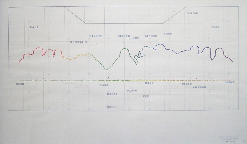 Per Calvino la pittura di Arakawa, puramente intellettuale, rende visibile “il colore della mente” – da cui il titolo della mostra: “la mente ha un colore che non riusciamo mai a vedere perche c’e sempre qualche altro colore che ci passa per la mente e si sovrappone al nostro sguardo. […] La mente non puo avere altro colore che quello dei quadri di Arakawa”.