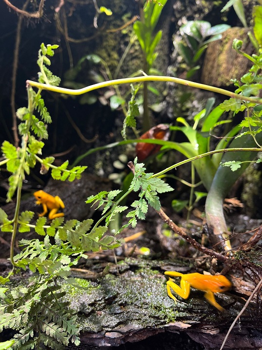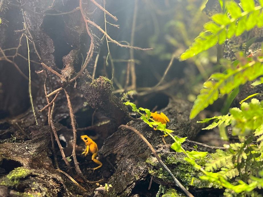 In un altro terrario della Serra sono ospitate delle piccole rane dai colori vivacissimi e dall’aspetto grazioso. Sono le “rane freccia”, che in realtà hanno quella colorazione perché la natura ha pensato bene di “metterle in evidenza” per la loro pericolosità. Il messaggio è: “non commestibili”. Questi piccoli anfibi sono tra gli animali più velenosi al mondo, anche perché si nutrono di insetti velenosi.
