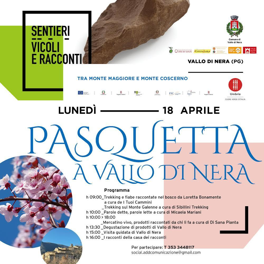 A Vallo di Nera (Pg), paese – monumento in Umbria, terra di racconti, che con il suo castello domina la Valnerina, si festeggerà la Pasquetta, lunedì 18 aprile2022, con una serie di iniziative en plein air, per godere della natura, dei cibi prelibati, delle perle artistiche custodite tra le mura del castello e dei racconti della tradizione.