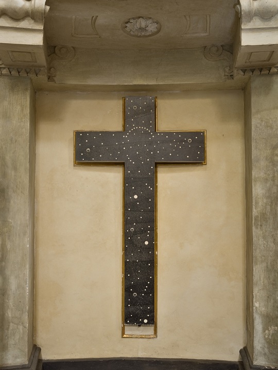 «Ombra che rischiara, luce che adombra. Siamo – scrive il curatore Massimo Silvotti – nell’Oratorio di San Cristoforo e già questa Cupola del Bibiena dove l’altezza è profondità, ci disorienta. Tutto è precipiziale, eppure saldo, possente, marmoreo. E la sontuosità del Barocco che pure ci cinge di allori, appare fuori casa, spaesata. La chiesa è un teatro, la preghiera, l’acuto di una soprano. È qui che s’innesta Galliani, anch’egli a suo modo Barocco, per sottrazione. Egli ci conduce lo sguardo verso dettagli vibranti, dove parrebbe che tutto abbia inizio. Il buio si riaccende e i neri o i grigi, svestendosi della loro opacità ci invitano a un sussulto di vita. Si avverte in lontananza un sussurro, somiglia a un richiamo, una eco. La solennità del silenzio».