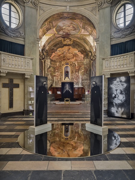 Curato da Massimo Silvotti (ideatore e direttore generale del Museo), il progetto si configura come una sorta di bi-personale sui generis, in cui tutto si rovescia e moltiplica per il tramite di una grande pedana rifrangente che raddoppia i quadri e gli affreschi. Il percorso espositivo comprende una quindicina di opere di Omar Galliani, distribuite all’interno della Chiesa e negli attigui locali dell’Oratorio di San Cristoforo, sede della Biblioteca di Poesia contemporanea. Se nella Chiesa è presentata una selezione di dipinti recenti di grandi dimensioni, tra cui i tre inediti “Botanica della fede” (2022), “Litania del cuore” (2022) e “Oltre la croce” (2022), nella Biblioteca sono esposte alcune opere storiche su tavola e su carta che illustrano il percorso dell’artista.
