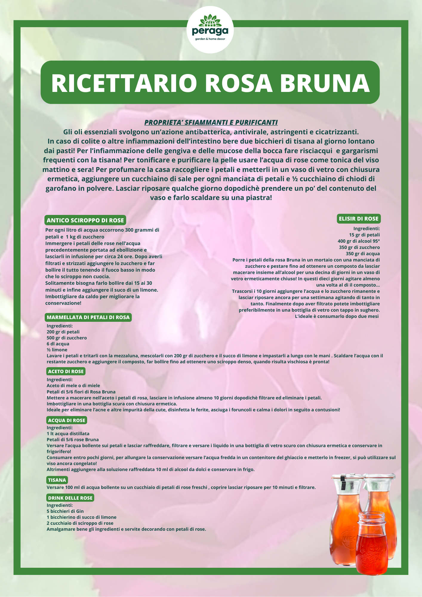Nel ricettario Peraga: ANTICO SCIROPPO DI ROSE MARMELLATA DI PETALI DI ROSA ACETO DI ROSE ACQUA DI ROSE TISANA AI PETALI DI ROSA DRINK DELLE ROSE ELISIR DI ROSE