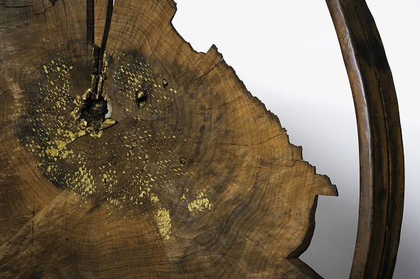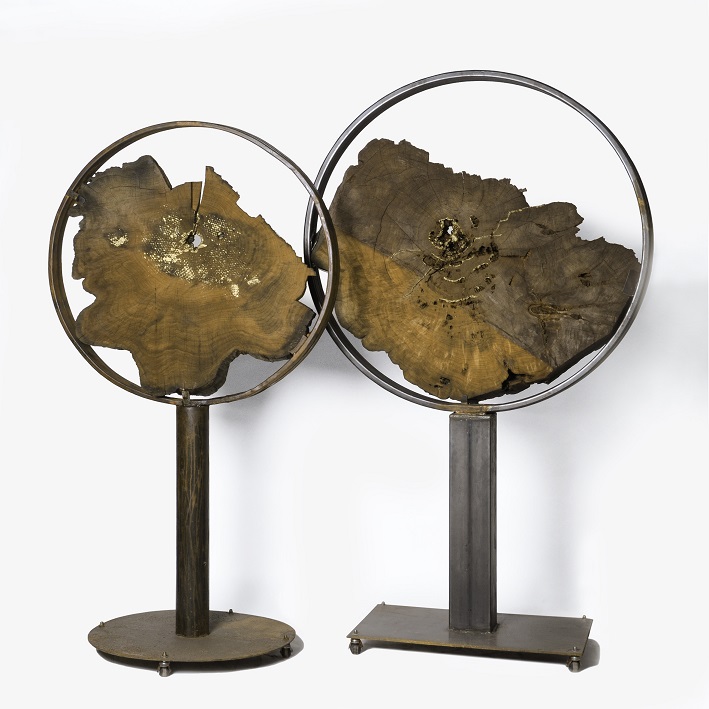 L’attenta scelta del materiale e dei suoi accostamenti rappresenta da sempre una peculiarità dell’arte di Maria Cristina Carlini. Così prende forma, nel 2021, la scultura Filemone e Bauci, composta da due grandi dischi di legno di recupero impreziositi da rivoli e “spugnature” d’oro, incastonati in una struttura in ferro che li sostiene e li custodisce immobili in un tempo sospeso.