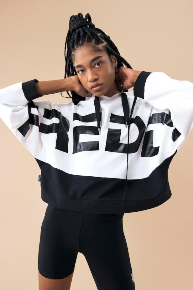 Il punto forte della linea è la sua versatilità rappresentata da maniche a kimono sulle felpe e il colorblock: il bianco e il nero si alternano tra parte superiore, che comprende cappuccio e maniche, e parte inferiore con stacco netto di colore.