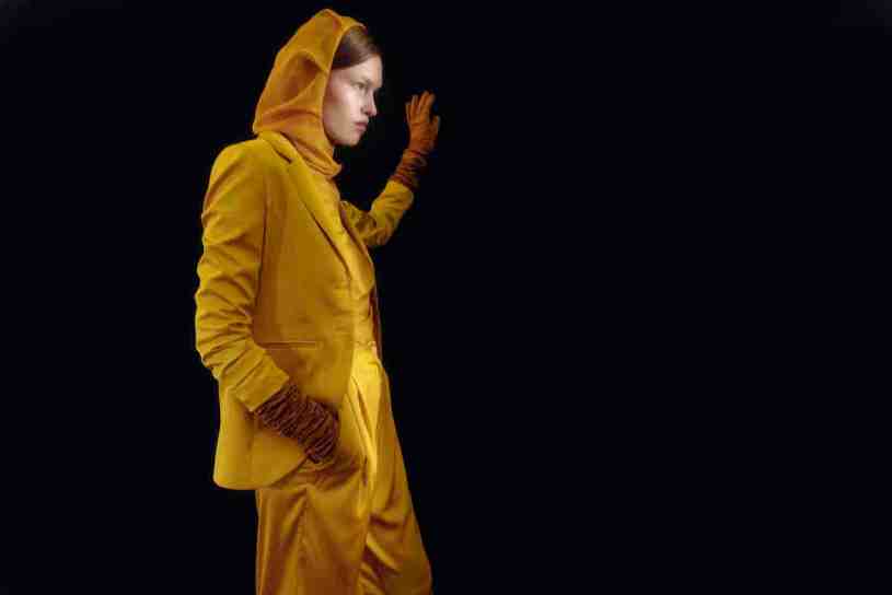 Ogni outfit obbedisce alla bussola creativa che indica la direzione trasversale: lì si orientano le forme, slegate dall’estetica diffusa ma allacciate in un processo di costruzione composto in stratificazioni e sovrapposizioni; lì giungono i capi che si fanno interscambiabili, nati da sostanze tessili volubili che si poggiano sulla pelle con leggerezza impalpabile, o avvolgono il corpo nella tridimensionalità protettiva.