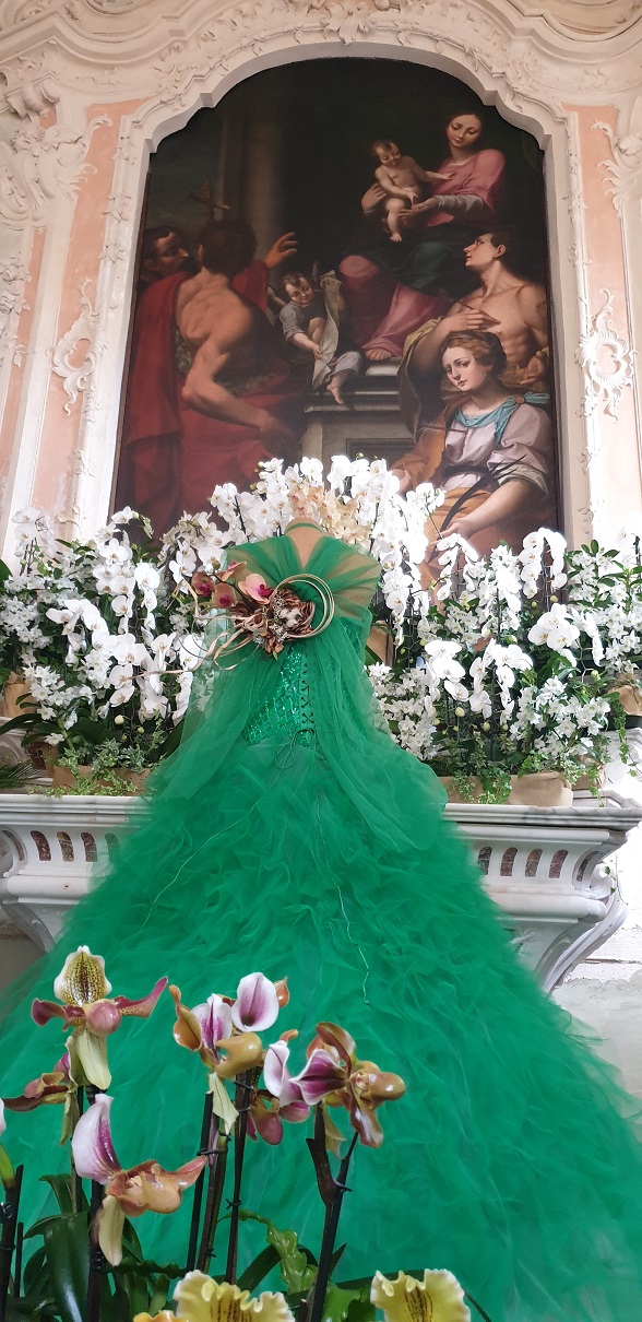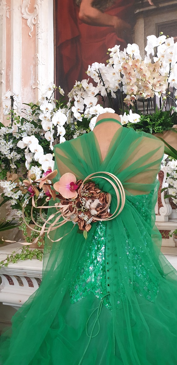 Il viaggio tra moda e fiori di Liguria non finisce qui, presso la Cappella Gentilizia un gioiello Haute Couture sarà esposto tra le meravigliose orchidee di Enrico Vincenzo, un abito da sposa in verde smeraldo, simbolo di speranza e sostenibilità.