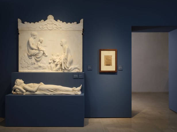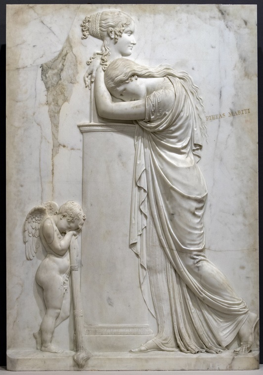 La mostra “Canova e il dolore. Le stele Mellerio. Il rinnovamento della rappresentazione sepolcrale”, ideata da Vittorio Sgarbi e curata da Francesco Leone e Stefano Grandesso, con la direzione artistica di Contemplazioni, che rimarrà aperta fino al 5 novembre, trova il suo apice nella ricomposizione, per la prima volta dal loro smembramento, dei due monumenti Mellerio, voluti dal conte Giacomo Mellerio in memoria dello zio Giovanni Battista e della moglie Elisabetta Castelbarco, dopo aver visitato lo studio romano di Canova. Il conte rimase colpito proprio da un monumento funebre al quale l’artista stava lavorando e gli commissionò le due stele funerarie, a cui Canova attese dal giugno 1812 al 1814, che giunsero a Gerno, presso Villa «Gernetto» Mellerio nell’agosto del 1814 per essere collocate in una cappella fatta costruire appositamente. Alle due opere canoviane si aggiunse nel 1825 il monumento che Giacomo Mellerio commissionò allo scultore Giuseppe De Fabris per commemorare la figlia Giovannina scomparsa prematuramente.