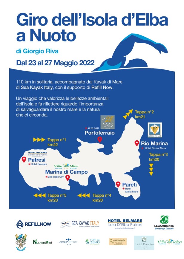 Da una parte un’epica impresa sportiva, dall’altra un forte messaggio ambientale: questo il duplice e virtuoso obiettivo del giro dell’Elba a nuoto, che il nuotatore e istruttore Giorgio Riva affronterà in solitaria in cinque tappe dal 23 al 27 maggio.