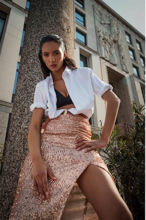 La donna NaraCamicie non teme di osare con abbinamenti inaspettati: felpe unisex indossate con irriverenza sopra gli abiti luccicanti della capsule creano un contrasto di stili e colori e rendono i capi perfetti per ognuna di loro.