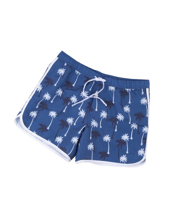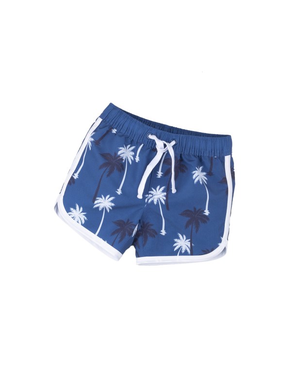 Le palme decorano anche le proposte maschili, passando dal costume blu in versione boxer ai dettagli del taschino sulla t-shirt bianca. Un coordinato per papà (tg.S-XL), baby (3-36 mesi) e kid (2-10 anni).