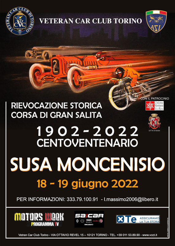 Il 18 e 19 giugno poi, a centoventi anni dalla prima edizione, il Veteran Car Club Torino proporrà una rievocazione storica della Susa-Moncenisio: non più una gara di velocità in salita ma una passeggiata turistica e culturale inserita nel calendario dell’ASI, a cui parteciperanno una settantina di auto ed una decina di moto storiche.