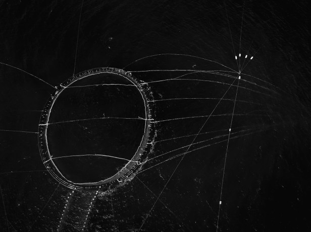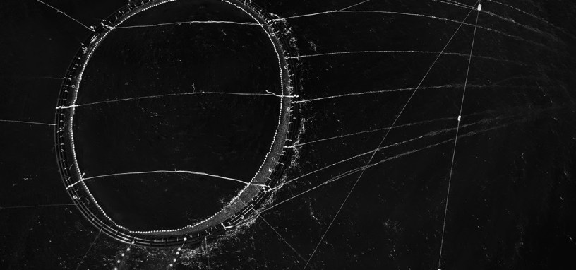 L’esposizione, visitabile fino al 30 giugno 2022, presenta una raccolta di 22 fotografie di grande formato che sembrano raffigurare delle costellazioni lontanissime, ma che in realtà sono tonnare, ossia reti da pesca inserite nel grande mare Mediterraneo fotografate da un drone: reti che itonnarotti – coloro che si occupano della mattanza –installano per catturare i tonni nella loro migrazione verso la costa.