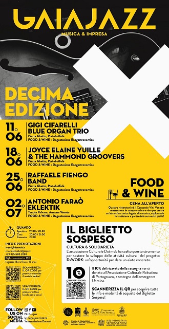 Giunto alla decima edizione, Gaiajazz Musica & Impresa è il palcoscenico del progetto D Work, organizzato e sviluppato dall’Associazione Culturale Dotmob, che si prefigge l’obiettivo di realizzare la sua mission per ampliare la conoscenza delle imprese e delle professionalità che valorizzano il territorio. Questo prestigioso festival è un magico luogo che abbraccia musica, arte e cultura d’impresa, quindi un’esperienza unica attraverso la quale organizzatori, partner e pubblico creano un’atmosfera davvero suggestiva. Quest’anno sarà introdotta anche una novità, una lodevole iniziativa che consiste nel “biglietto sospeso”, ossia un’opportunità per sostenere concretamente le attività culturali del progetto D Work acquistando un biglietto in più. Il 10% del ricavato della rassegna sarà devoluto all’associazione Roksolana di Portogruaro a sostegno dell’emergenza Ucraina. Dunque, un ammirevole gesto di solidarietà in un momento così drammatico come questo.