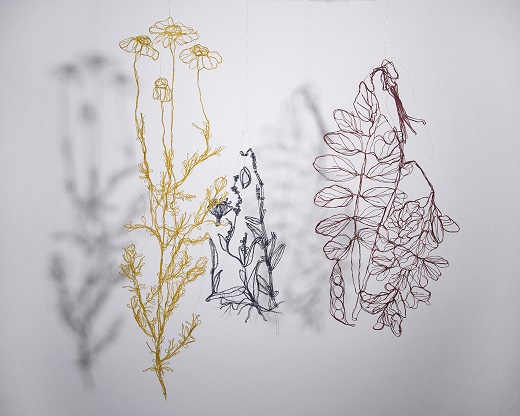 Una suggestiva unione tra il filo, che disegna nell’aria questi elementi naturali e gli spazi suggestivi dell’atelier, che si trasformano nella sua pagina, bidimensionale e tridimensionale allo stesso tempo, offrendo una libertà progettuale e interpretativa che innesca una riflessione sulla caducità del mondo naturale: alcune piante sono infatti a rischio estinzione, altre ancora sono state chimicamente sostituite.